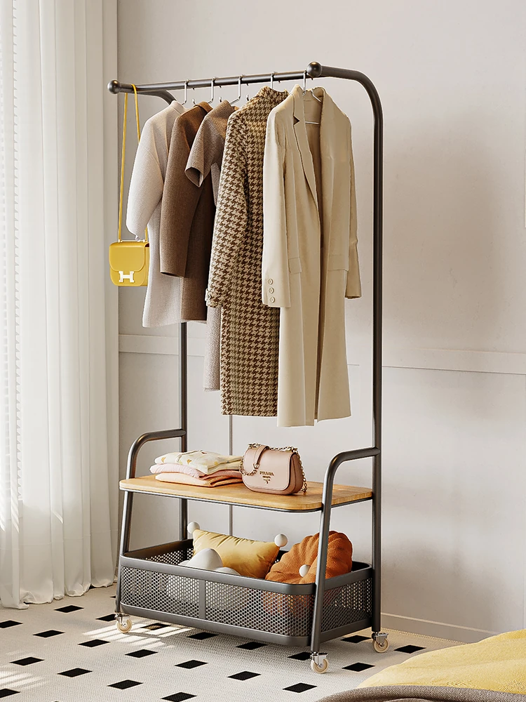 移動式衣類収納ラック!おしゃれなデザインのバスケット付きハンガーラック。寝室や家のどこでも使いやすく、キャスター付きで移動も簡単。あなたのライフスタイルにぴったりなクリエイティブな衣類掛けです!