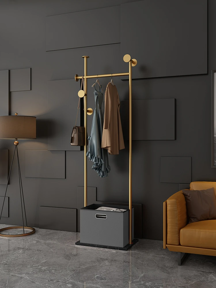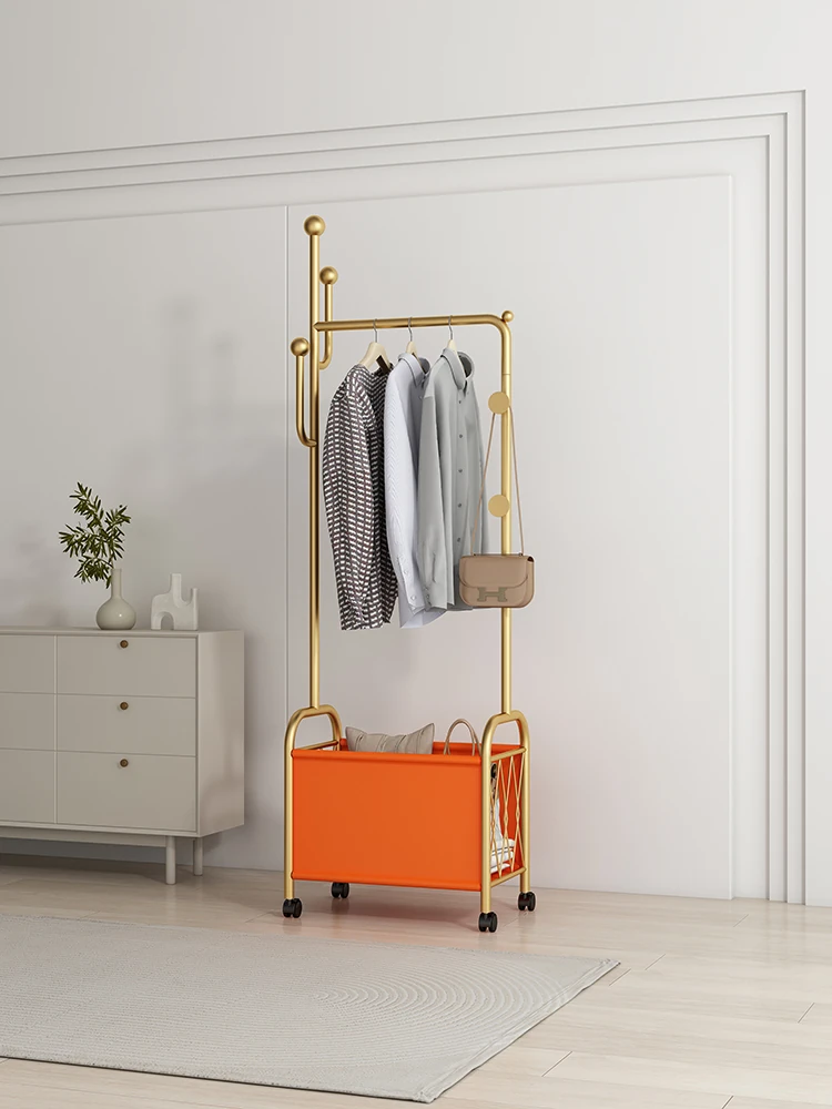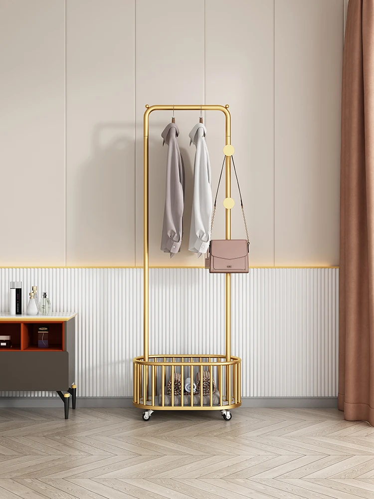 イタリアンラグジュアリーのフロアコートハンガー - 寝室やベッドサイドに最適!夜のお洋服や小物を美しく収納できる、便利なランドリーバスケット付きのスタイリッシュなアイテム。お部屋をおしゃれに演出します!