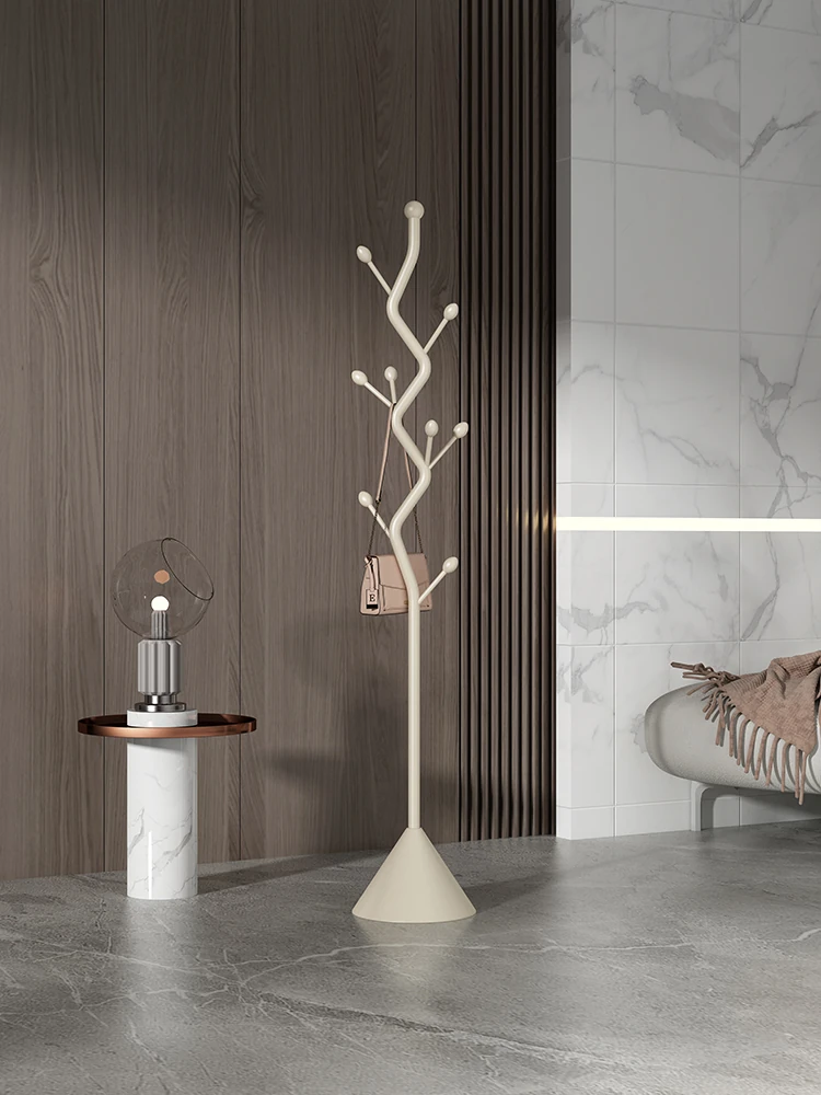 クリーム色の風合いが魅力的なスタイリッシュなコートハンガー - 寝室にぴったりな小型立体衣類ラック!高級感溢れるアートデザインで、コートや帽子をおしゃれに収納できます。