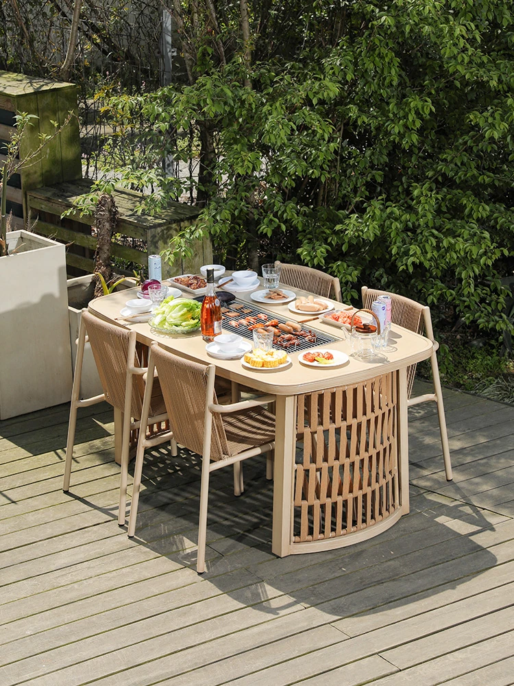 アウトドアバーベキューテーブルセット - ヴィラや庭に最適!リラックスできるラタン椅子と防水・UVカットの円形テーブル付き。屋外での食事やくつろぎのひとときを楽しむために、理想的な選択です!
