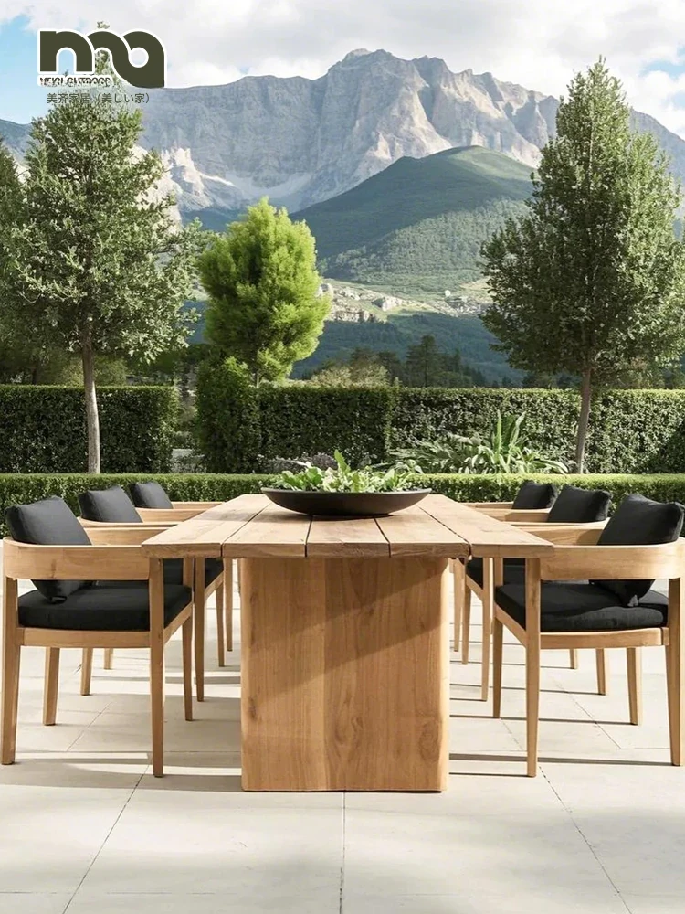 美齐アウトドア防腐チーク材テーブル&チェアセット - 別荘や庭に最適!防水機能付きの大きなテーブルで、屋外テラスやガーデンパーティーを楽しもう!高品質の無垢材で耐久性抜群!