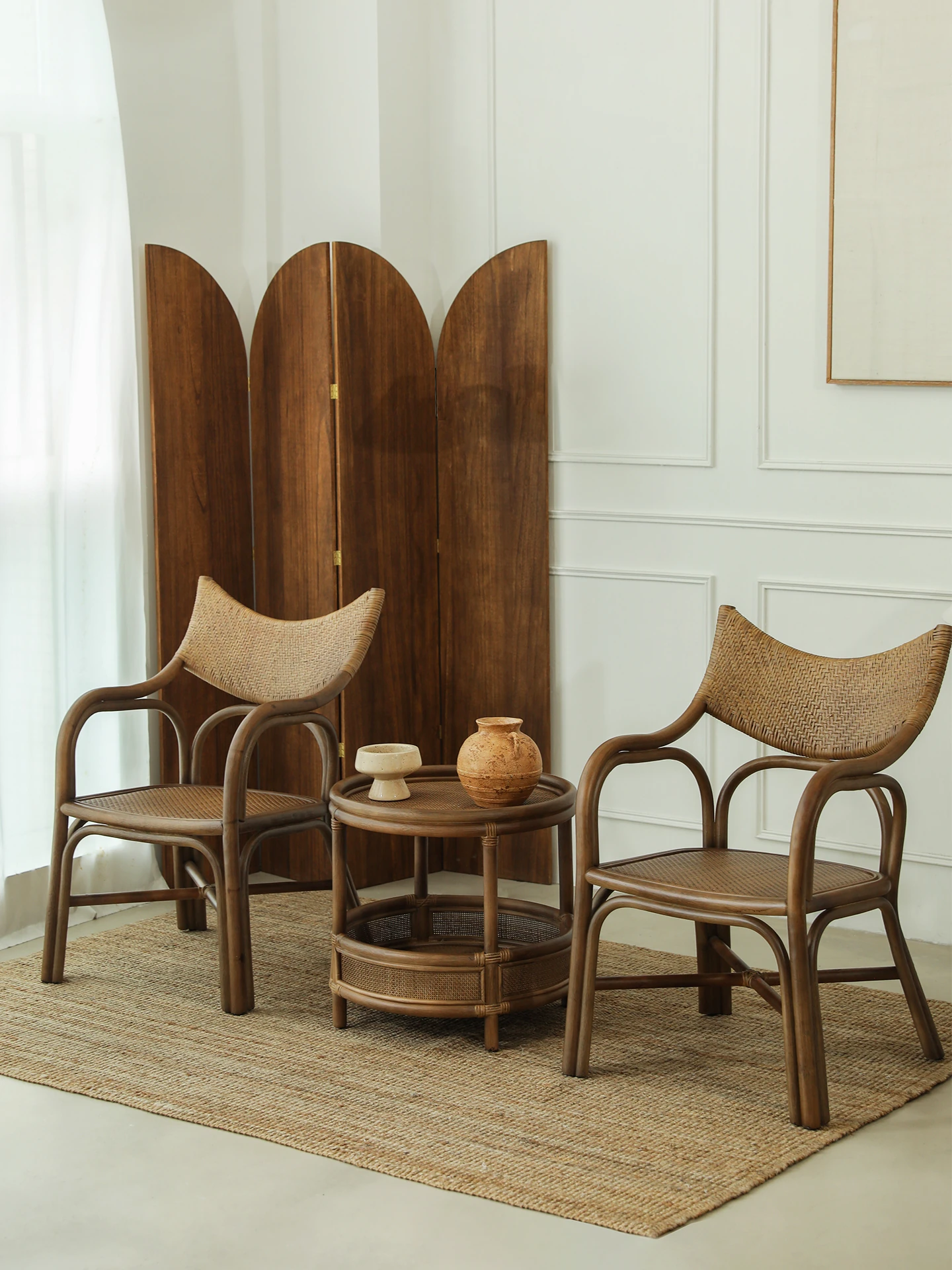 美齐のバルコニー小型テーブルセット|おしゃれな読書&ティータイムに最適!天然木製の背もたれ付き椅子とラタン編みのダイニングテーブルの組み合わせで、古風な雰囲気を演出。心地よいひとときをお楽しみください。