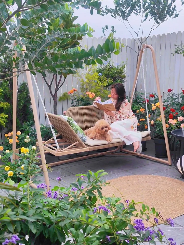 おしゃれなアウトドア用の庭用ハンモックチェア!ヴィラやバルコニーにぴったりな二人用の揺れる吊り椅子。リラックスできる藤製のデザインで、人気のガーデンハンモックとして最適です。心地よいひとときをお楽しみください!
