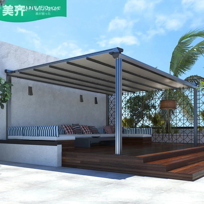 アウトドアパビリオン、庭や屋上に最適なアルミ合金製の電動伸縮折りたたみ日よけテント!晴れの日も雨の日も安心して楽しめる、スタイリッシュなデザインで快適な空間を演出します。