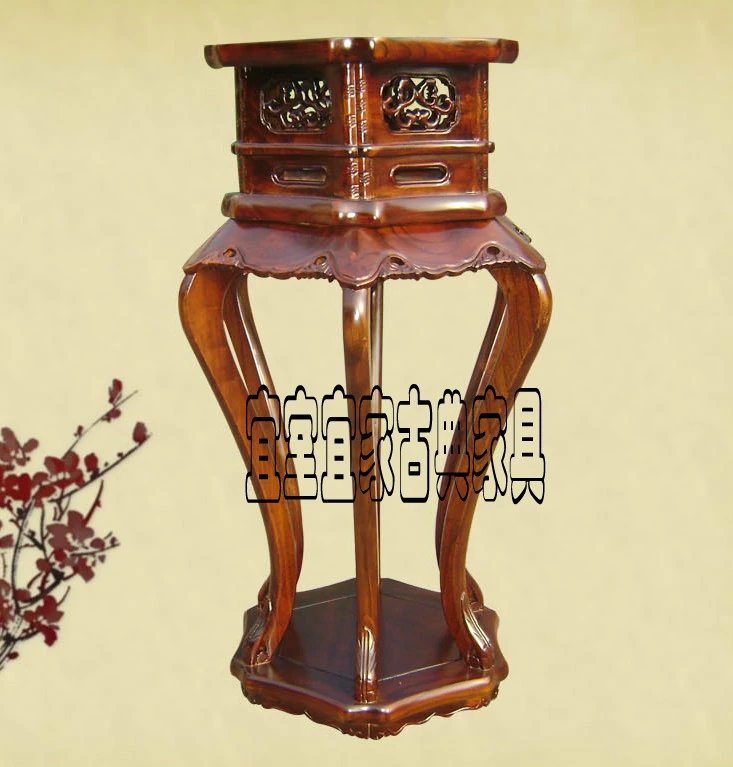 Antique-Style Old Elm Flower Stand with Hexagonal Vase Holder - Perfect for Your Study or Living Room, Ideal for Displaying Floral Arrangements and Unique Stones.