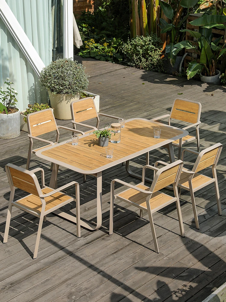 Outdoor Plastic Wood Dining Set - Stylish Patio Table and Chairs for Garden, Villa, and Café. Perfect for Relaxing and Entertaining in Your Outdoor Space!