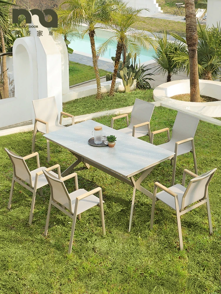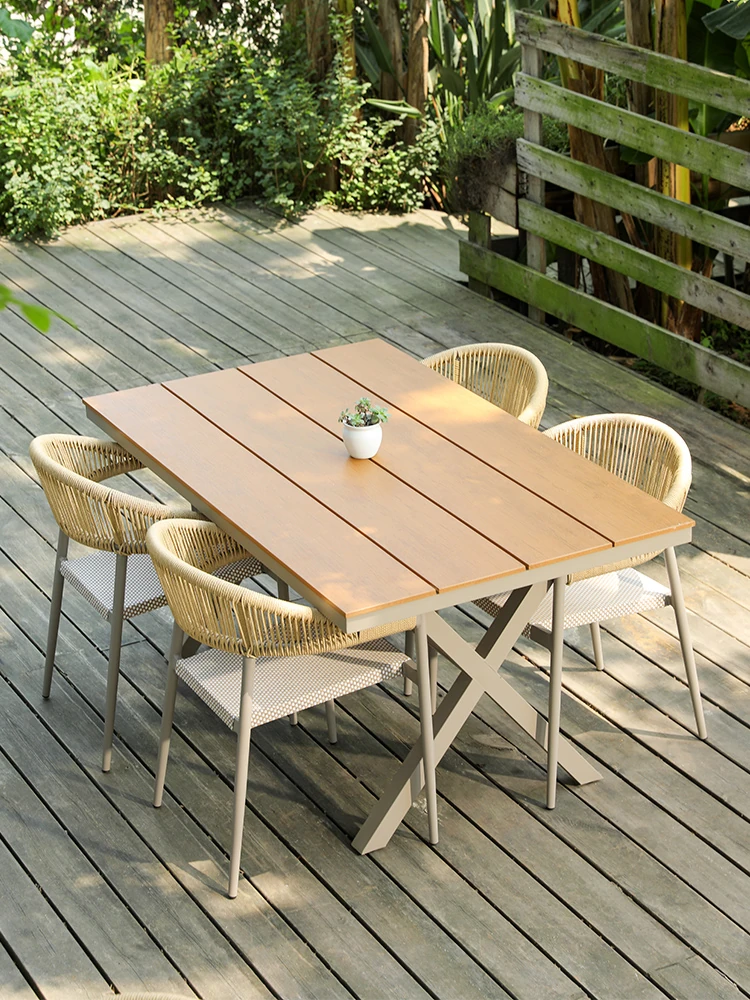 マギーのアウトドアテーブル&チェアセット - ヴィラや庭にぴったりのリラックスできるラタンチェアとトレンディなアルミニウム合金製ダイニングテーブルのコンビネーション。美しい風景の中で特別なひとときをお楽しみください!