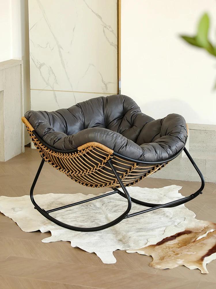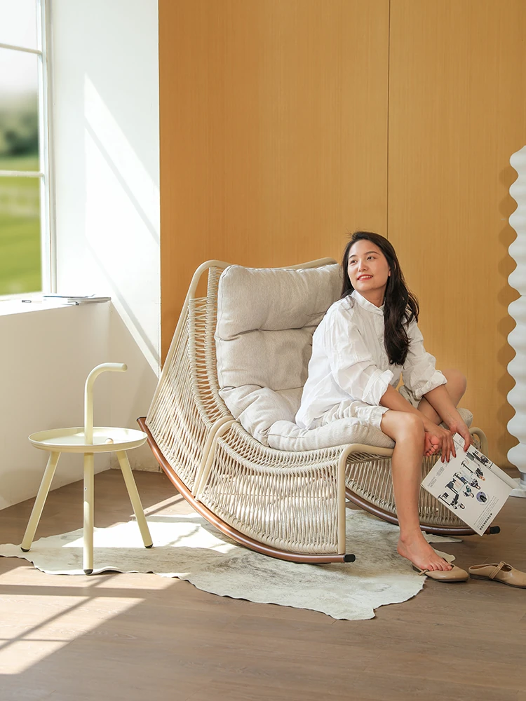 デザイナーオリジナルのラウンジソファチェア、北欧スタイルのリラックスチェア!流行のクリエイティブでシンプルなデザイン、客間にぴったりの籐編みロッキングチェア。心地よいひとときをお届けします!